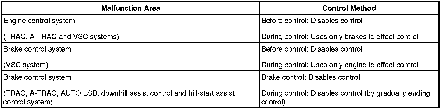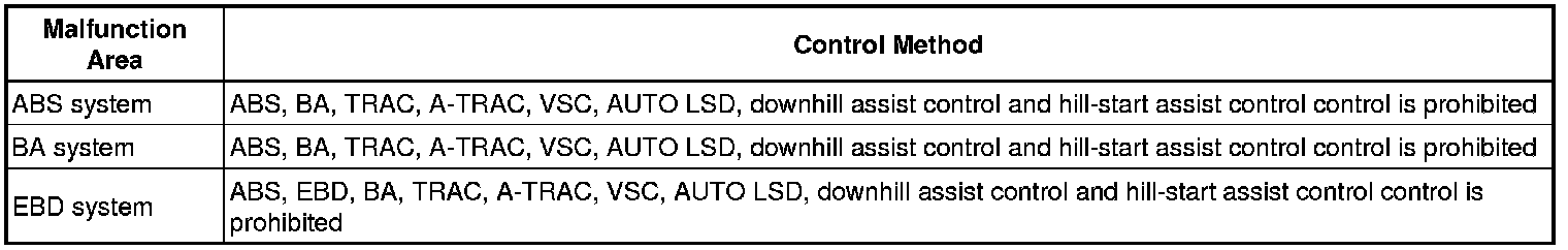 HINT: As for the TRAC, A-TRAC, VSC, AUTO LSD, downhill assist control and hill-start assist control systems, different systems prohibit different controls according to a malfunctioning part.
