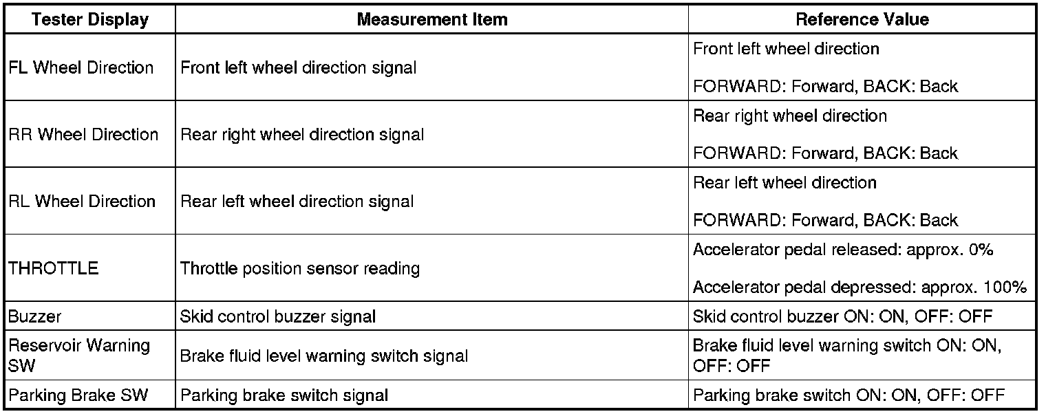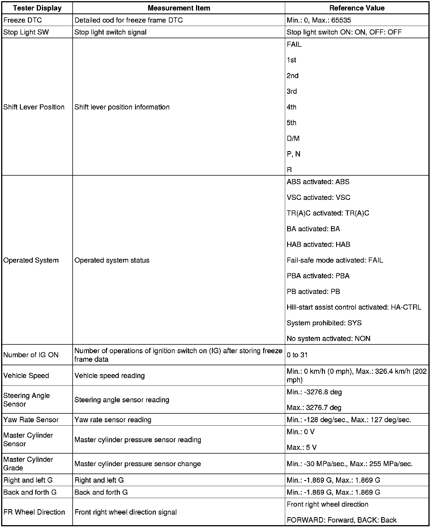 - Freeze frame data at the time the ABS operates: The skid control ECU stores and updates data whenever the ABS system operates. When the ECU stores data at the time a DTC is detected, the data stored when the ABS operated is erased.