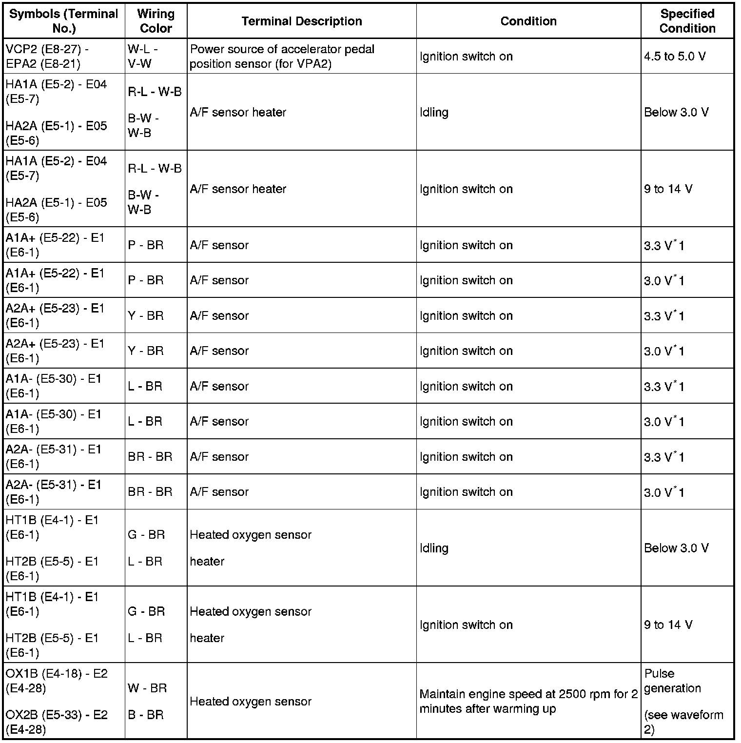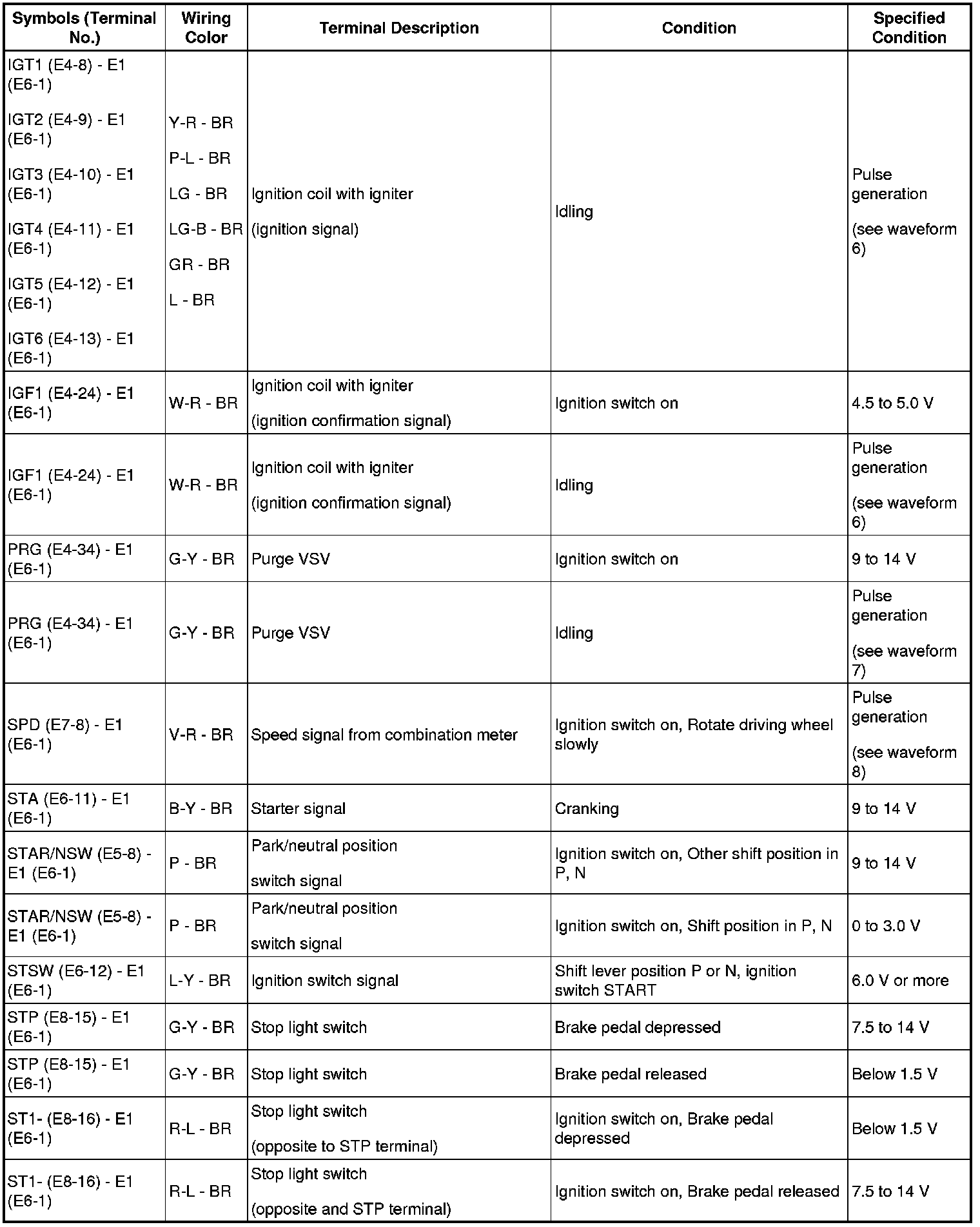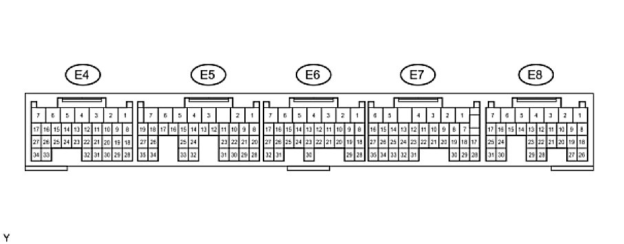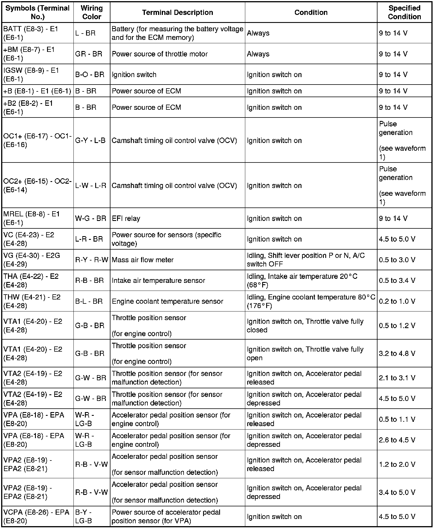 HINT: The standard normal voltage between each pair of ECM terminals is shown in the table below. The appropriate conditions for checking each pair of terminals are also indicated. The result of checks should be compared with the standard normal voltage for that pair of terminals, displayed in the Specified Condition column. The illustration above can be used as a reference to identify the ECM terminal locations.