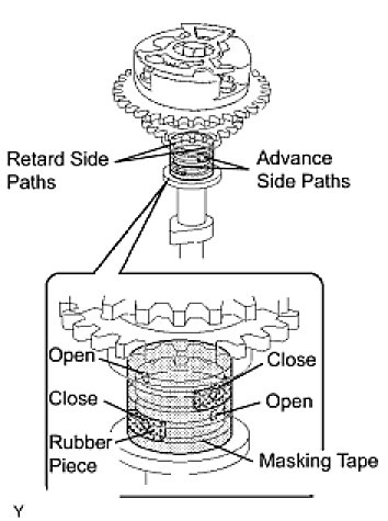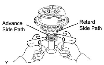 (4) Confirm that the camshaft timing gear assembly rotates in the advance direction when reducing the air pressure applied to the retard path.