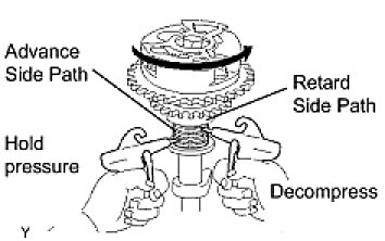 NOTICE: The camshaft timing assembly gear occasionally shifts to the retard side abruptly, if air compression of the advanced side path is released first. It often results in the breakage of the lock pin.