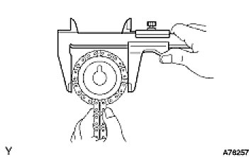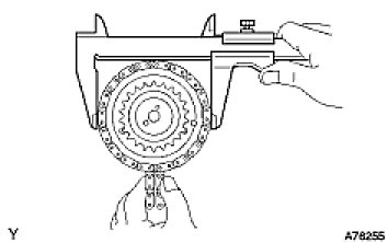 (b) Using vernier calipers, measure the camshaft timing gear diameter with the chain.