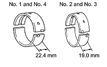 HINT: Main bearings come in widths of 19.0 mm (0.748 in.) and 22.4 mm (0.882 in.). Install the 22.4 mm (0.882 in.) bearings in the No. 1 and No. 4 cylinder block journal positions with the main bearing cap. Install the 19.0 mm (0.748 in.) bearings in the No. 2 and No. 3 positions.