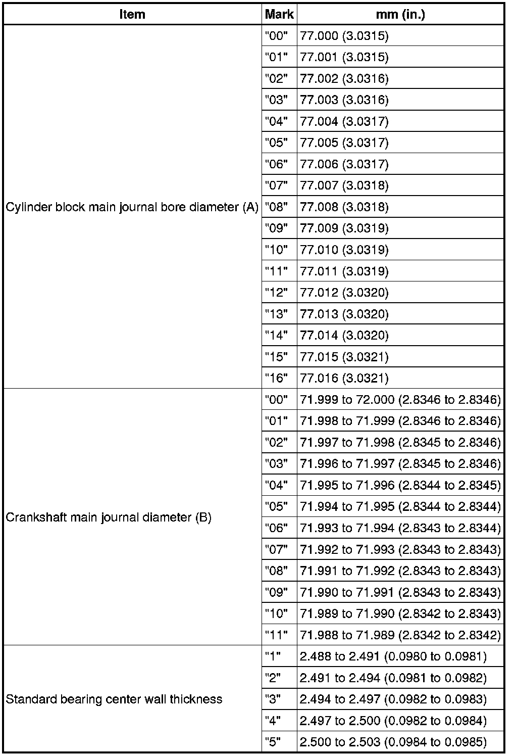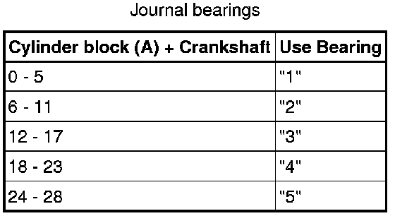 (s) If replacing a bearing, replace it with one that has the same number. If the number of the bearing cannot be determined, select the correct bearing by adding together the numbers imprinted on the cylinder block and crankshaft, then refer to the table below for appropriate bearing number. There are 5 sizes of standard bearings, marked "1", "2", "3", "4" and "5" accordingly.