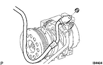 (a) Remove the nut and disconnect the discharge hose sub-assembly from the compressor and magnetic clutch.