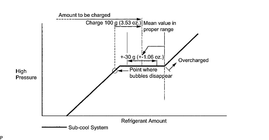 - Approximately 100 g (3.53 oz.) of refrigerant may need to be charged after bubbles disappear. The refrigerant amount should be checked by measuring its quantity, and not with the sight glass.