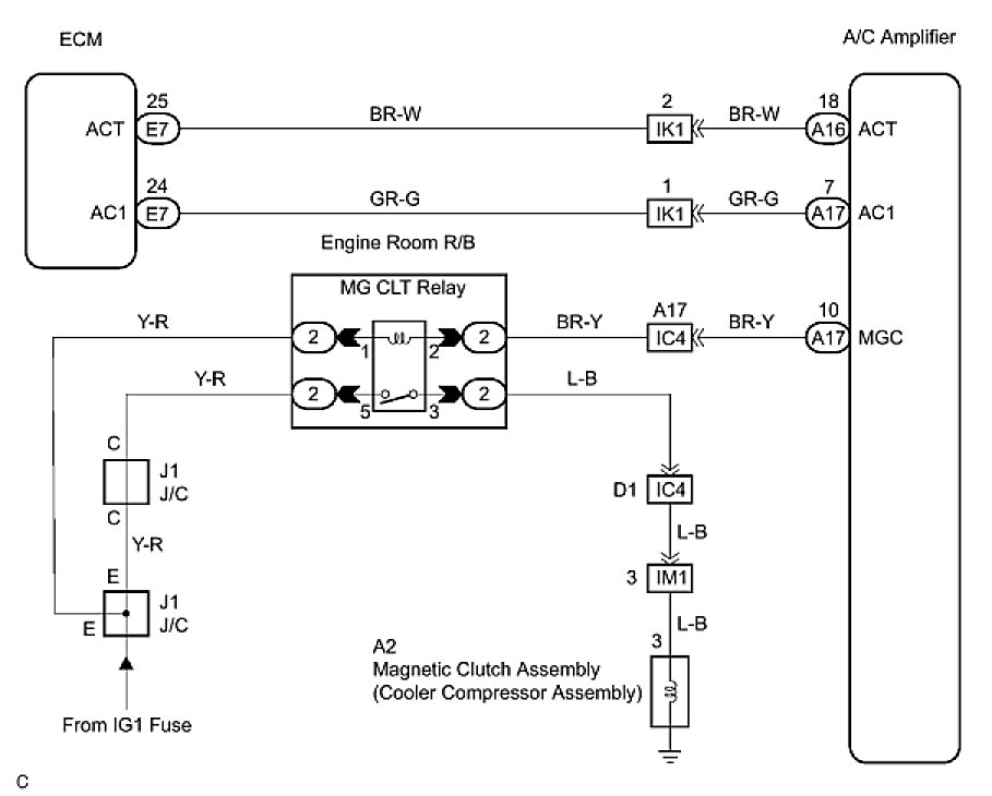 The A/C amplifier outputs the magnetic clutch ON signal from AC1 terminal to the ECM. When the ECM receives this signal, it sends a signal from ACT terminal and the A/C amplifier switches the A/C magnetic clutch relay ON. This turns the A/C magnetic clutch on.