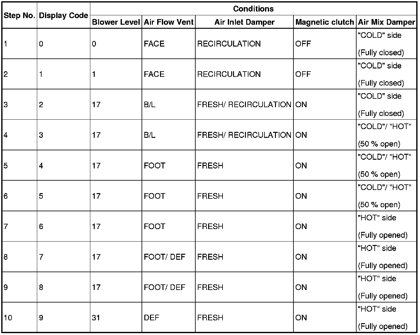 (d) As the actuator check is repeated from steps 1 to 10 at 1 second intervals, check the temperature and air flow visually and by hand.