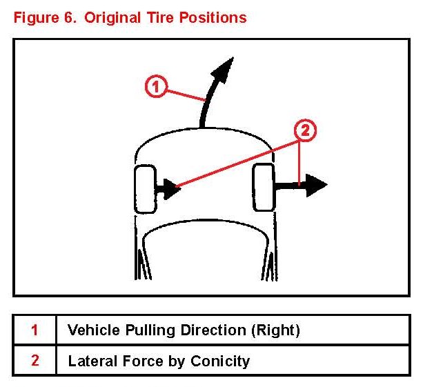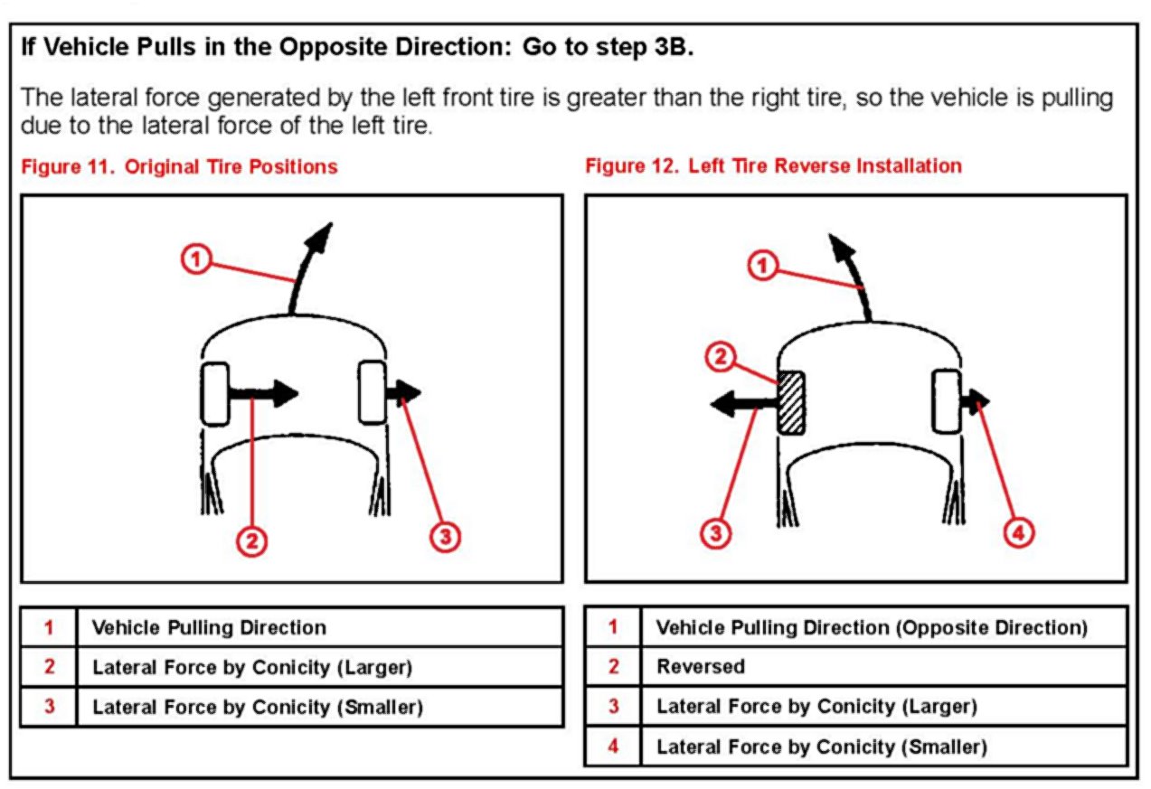 ^ If the pulling direction does not change after the front tires are switched the cause of vehicle pulling is not tire conicity. In this case the likely cause is a front wheel alignment condition.