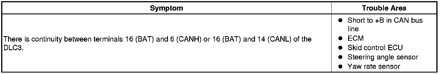A short to +B is suspected in the CAN bus line when there is continuity between terminals 16 (BAT) and 6 (CANH) or terminals 16 (BAT) and 14 (CANL) of the DLC3.