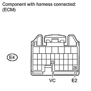(2) Using a voltmeter, measure the voltage between connector terminals VC and E2 on the wiring harness side of the ECM.