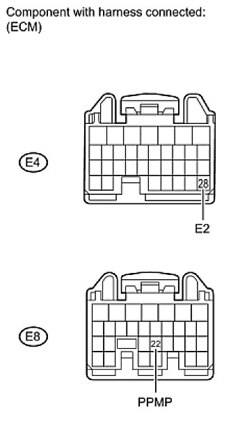 (3) Using a voltmeter, measure the voltage between connector terminals PPMP and E2 on the wiring harness side of the ECM.