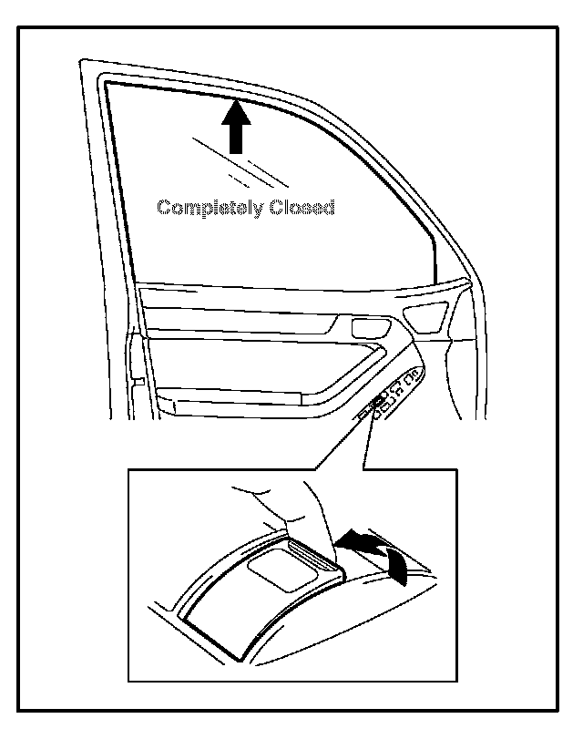 Turn the ignition switch to the "ON" position. Halfway close the door glass by pressing the switch. Then fully pull up on the switch until the door glass is fully closed, and continue holding the switch for approximately 12 seconds after the door glass is fully closed.