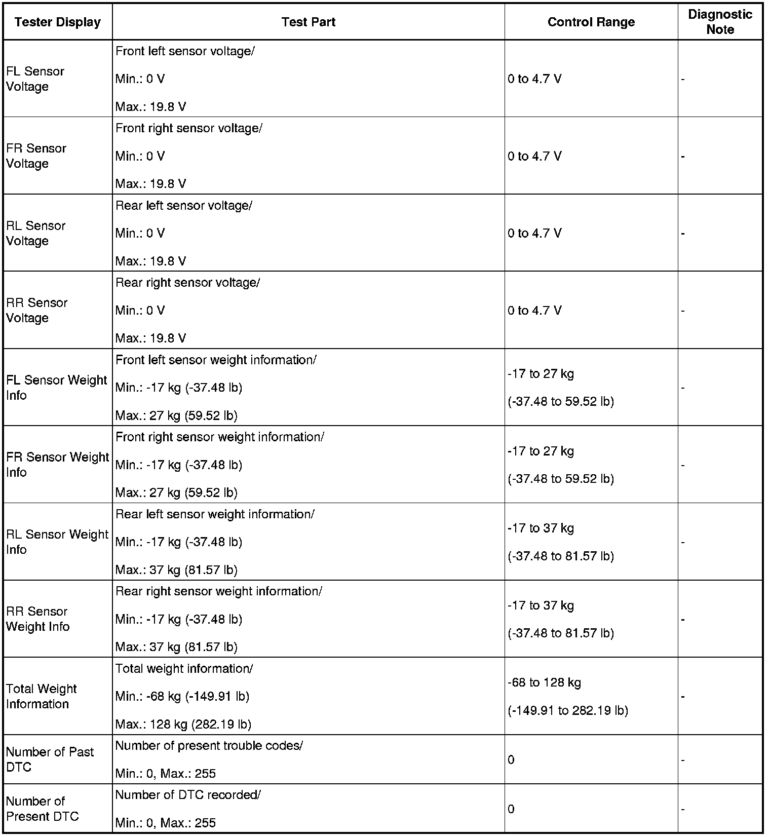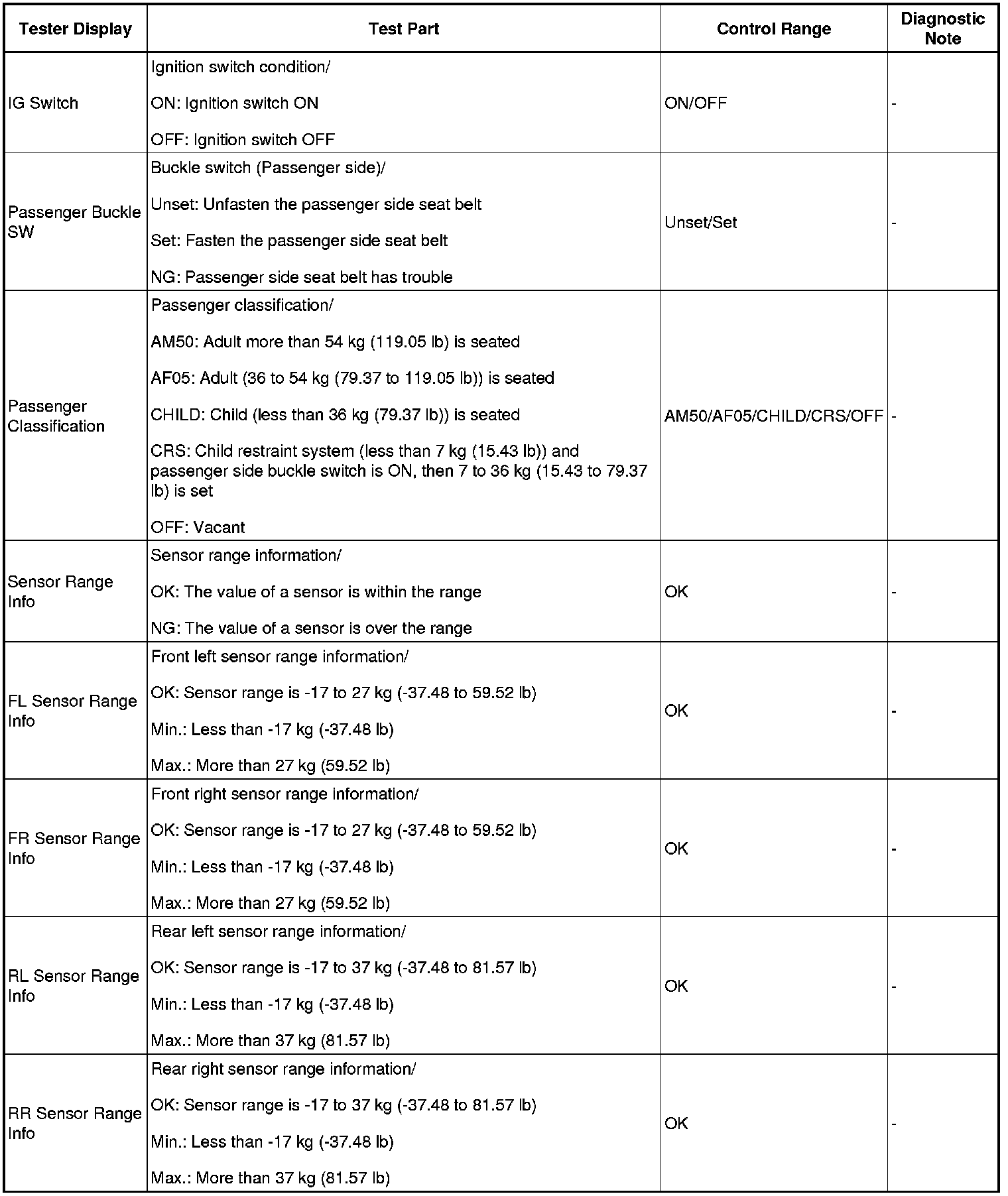 1. DATA LIST FOR OCCUPANT CLASSIFICATION ECU