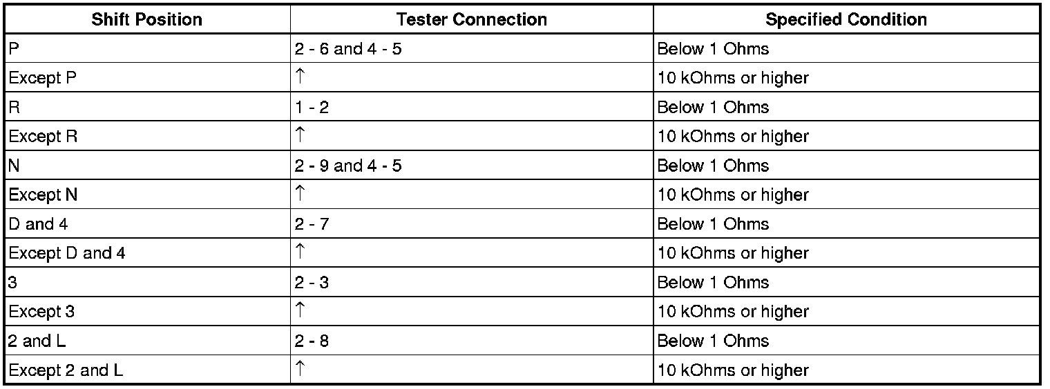 (c) Measure resistance according to the value(s) in the table below when the shift lever is moved to each position.