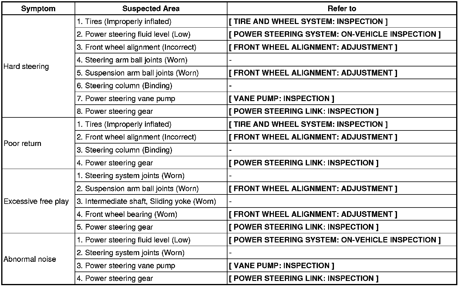 POWER STEERING: POWER STEERING SYSTEM: PROBLEM SYMPTOMS TABLE