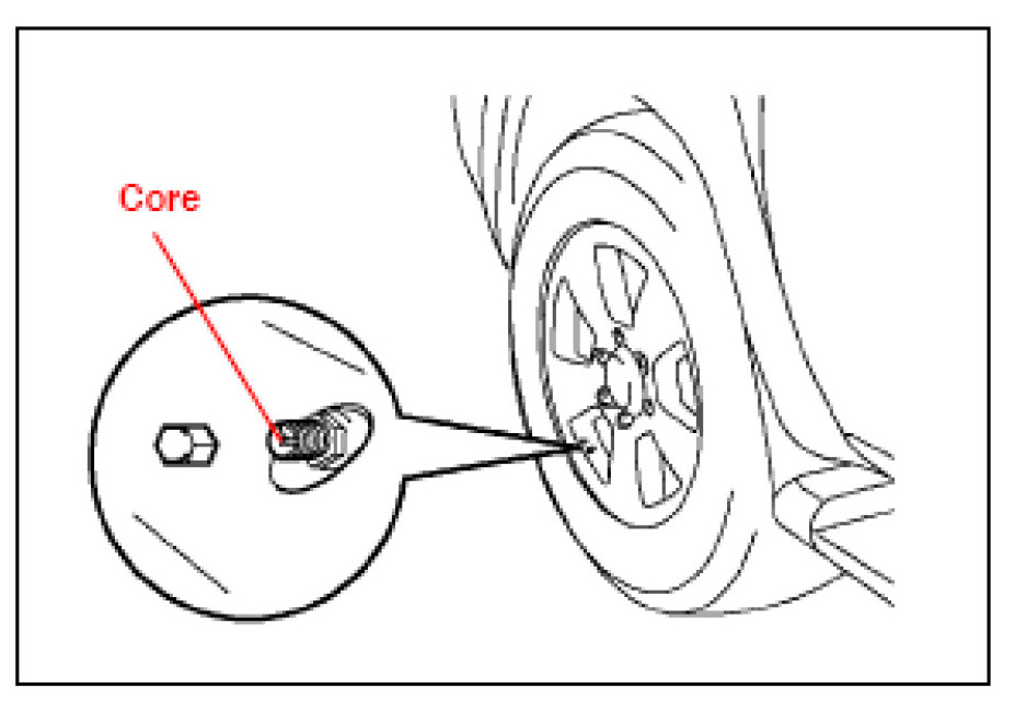3. Press or remove the valve core to reduce the tire inflation pressure rapidly by 6 psi (0.4kgf/cm2, 40kPa), or more, within 30 seconds.