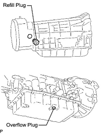 (b) Fill the transmission through the refill hole until fluid begins to trickle out of the overflow tube.