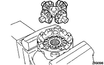 (b) Install the 4 rear differential pinion thrust washers and rear differential pinion gears onto the rear differential spider.