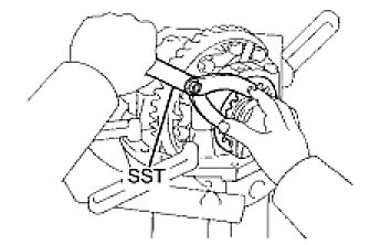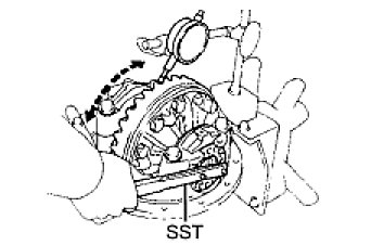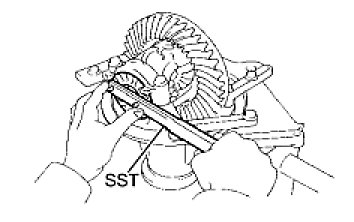 (e) While turning the ring gear, use the SST to fully tighten the adjusting nut on the drive pinion side.