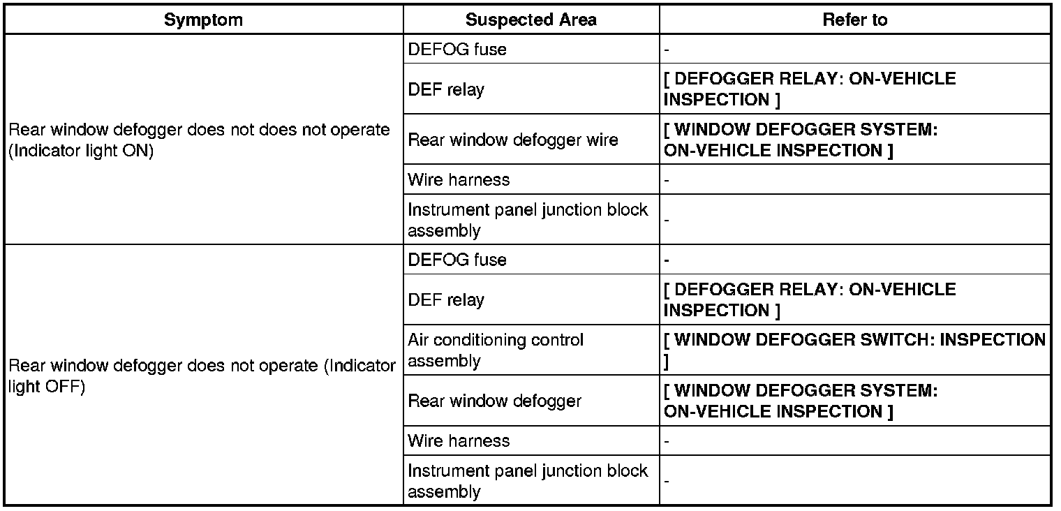 / WINDOWGLASS: WINDOW DEFOGGER SYSTEM: PROBLEM SYMPTOMS TABLE