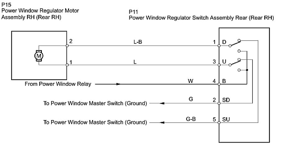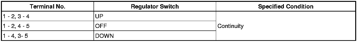 If the manual UP/DOWN function does not operate, the power window motor, the regulator switch or the wire harness may be malfunctioning.