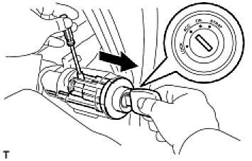 (b) Push down the stop pin with a screwdriver and pull out the ignition switch lock cylinder.