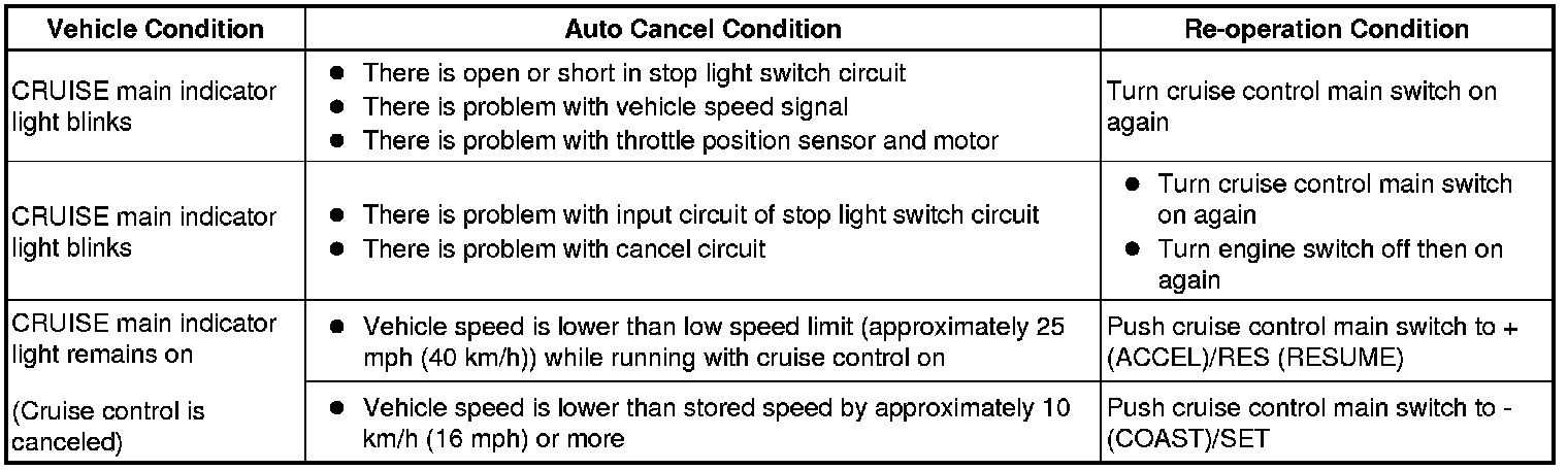 HINT: If the following conditions are detected while the cruise control is in operation, the system clears the stored vehicle speed in the ECM and cancels the cruise control operation.