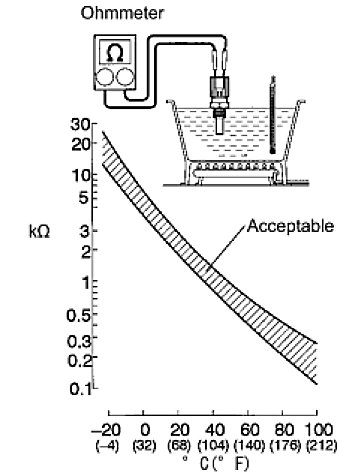 NOTE: If checking the engine coolant temperature sensor in water, be careful not to allow water to enter the terminals. After checking, wipe the water off the engine coolant temperature sensor.