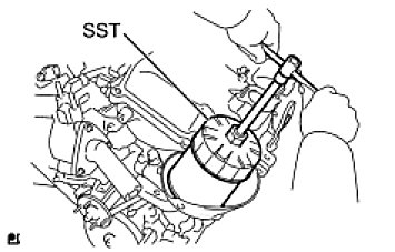 (b) While removing the oil filter with SST, catch the oil from the oil filter with a container.
