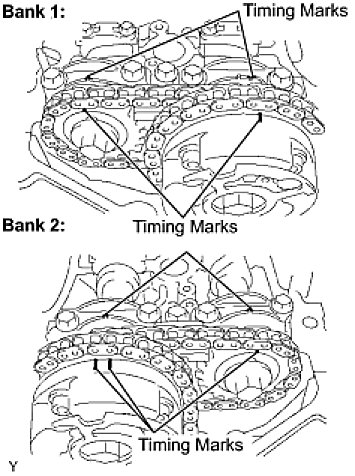 (b) Check that the timing marks of the camshaft timing gears are aligned with the timing marks located on the No. 1 and No. 2 bearing caps as shown in the illustration.