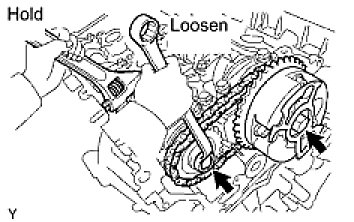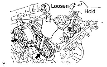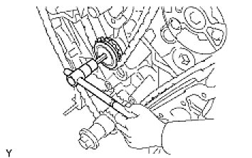 (b) Hold the hexagonal portion of the camshaft with a wrench, and remove the 2 bolts, camshaft timing gear, camshaft timing gear assembly and No. 2 timing chain.