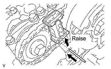 (a) While raising chain tensioner No. 2 upward, insert a pin of dia 1.0 mm (0.039 in.) into the hole to fix it.