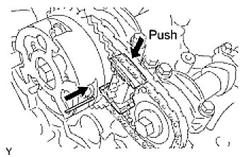 (a) While turning the stopper plate of the tensioner upward, push in the plunger of the chain tensioner as shown in the illustration.