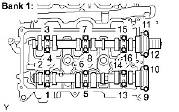 (1) Using several steps, uniformly loosen and remove the 16 bearing cap bolts in the sequence shown in the illustration.