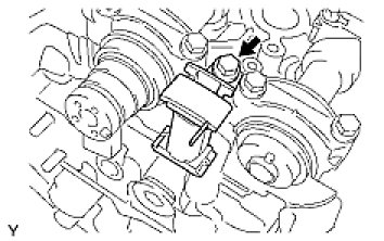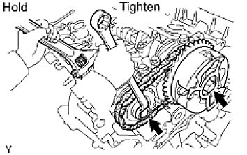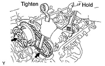 (d) Hold the hexagonal portion of the camshaft with a wrench, and tighten the 2 bolts.