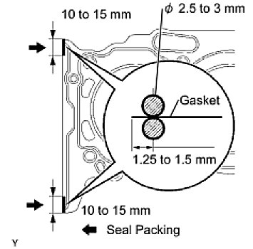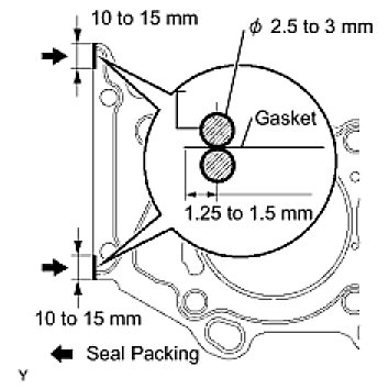 (b) Apply a continuous bead of seal packing (diameter 2.5 to 3 mm (0.098 to 0.118 in.)) to a new cylinder head gasket as shown in the illustration.