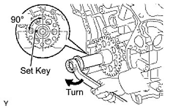 (5) Using a wrench, turn the camshafts clockwise until each camshaft knock pin comes to a position 90° to the cylinder head.