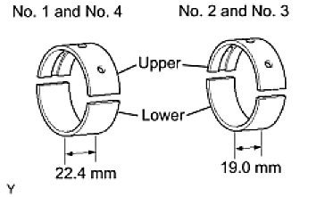 - The widths of the No. 1 and No. 4 journal bearings are different from those of the No. 2 and No. 3 journal bearings. Therefore, confirm the identity of each journal bearing prior to installation.