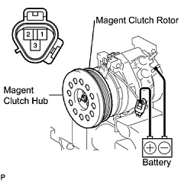 (1) Confirm that the magnet clutch hub and magnet clutch rotor lock when the battery positive lead is connected to terminal 3 (MG+) of the magnet clutch, and the negative lead is connected to the earth wire.