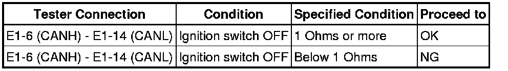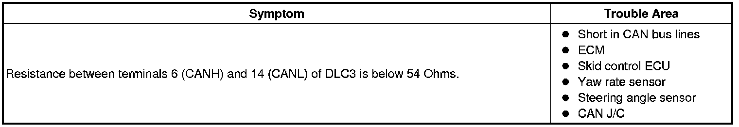 The CAN bus lines are considered to be shorted when the resistance between terminals 6 (CANH) and 14 (CANL) of the DLC3 is below 54 Ohms.