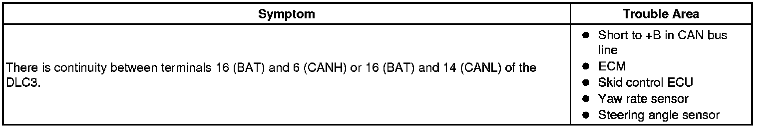 A short to +B is suspected in the CAN bus line when there is continuity between terminals 16 (BAT) and 6 (CANH) or terminals 16 (BAT) and 14 (CANL) of the DLC3.