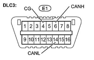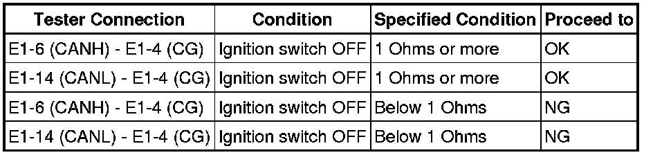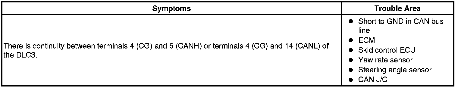 A short to GND is suspected in the CAN bus line when there is continuity between terminals 4 (CG) and 6 (CANH) or terminals 4 (CG) and 14 (CANL) of the DLC3.