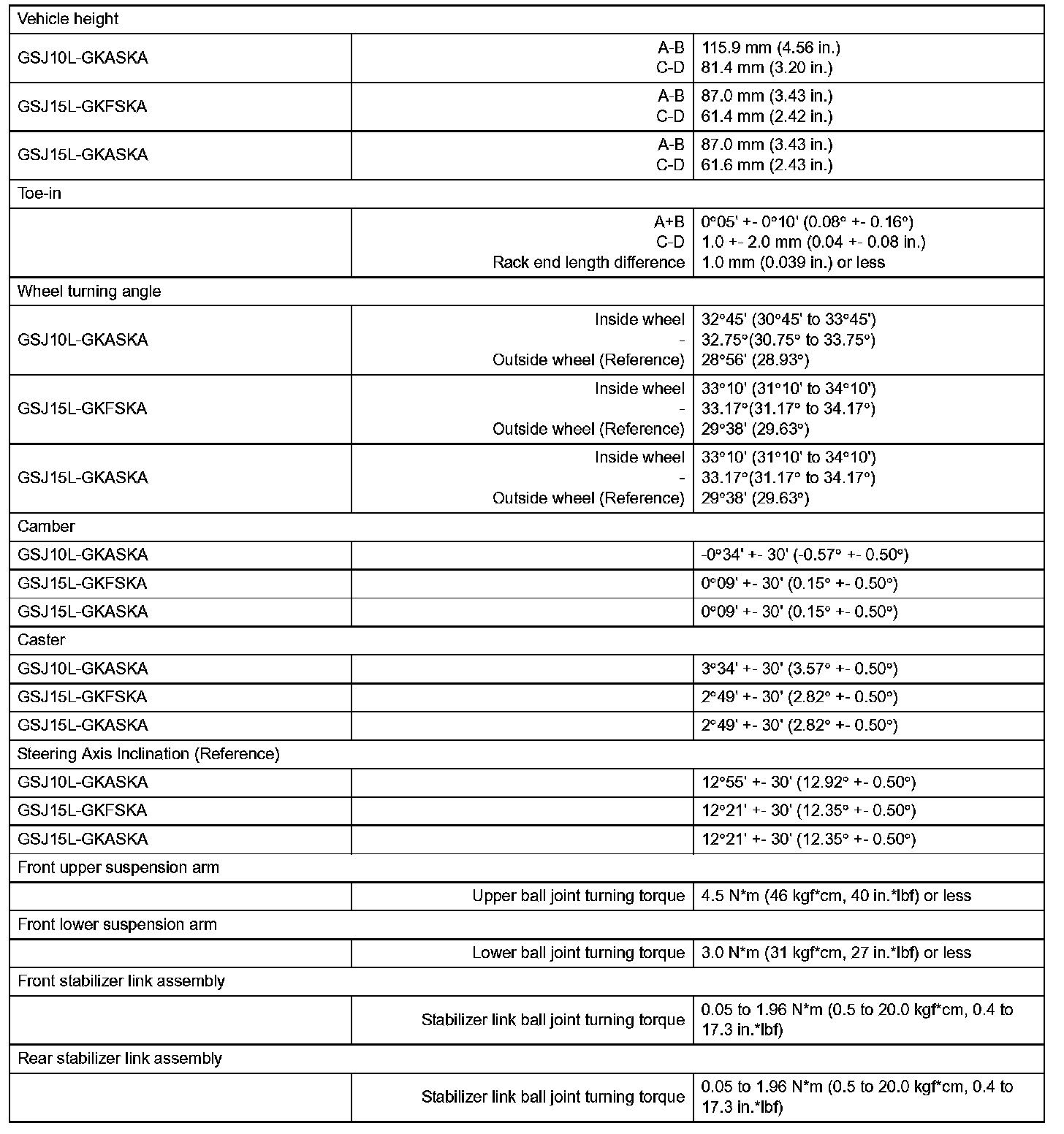 Wheel Alignment Specifications