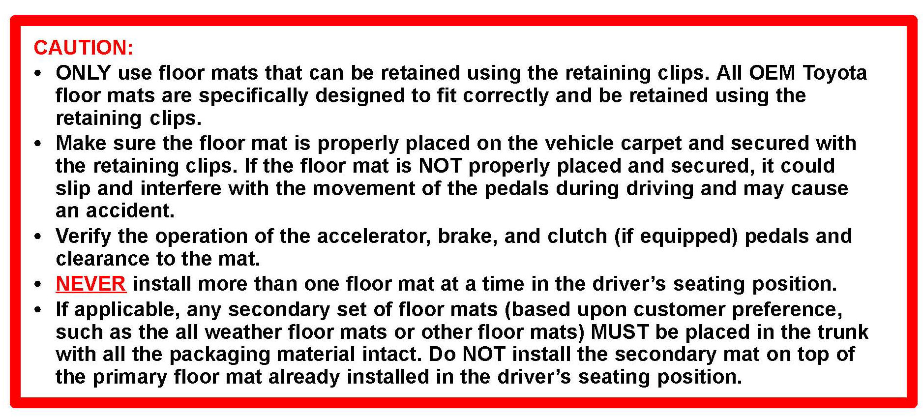 2008 model year Toyota vehicles are equipped with floor mat retaining clips to help ensure that the floor mats stay in the correct position. Attach the floor mat to the vehicle carpet using the floor mat retaining clips during Pre-Delivery Service (PDS).