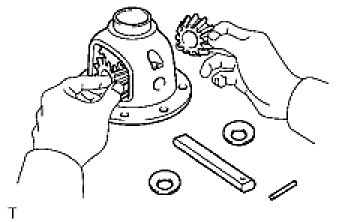 (b) Install the 2 side gears, 2 pinion gears, 2 side gear thrust washers, 2 pinion thrust washers and pinion shaft into the differential case.