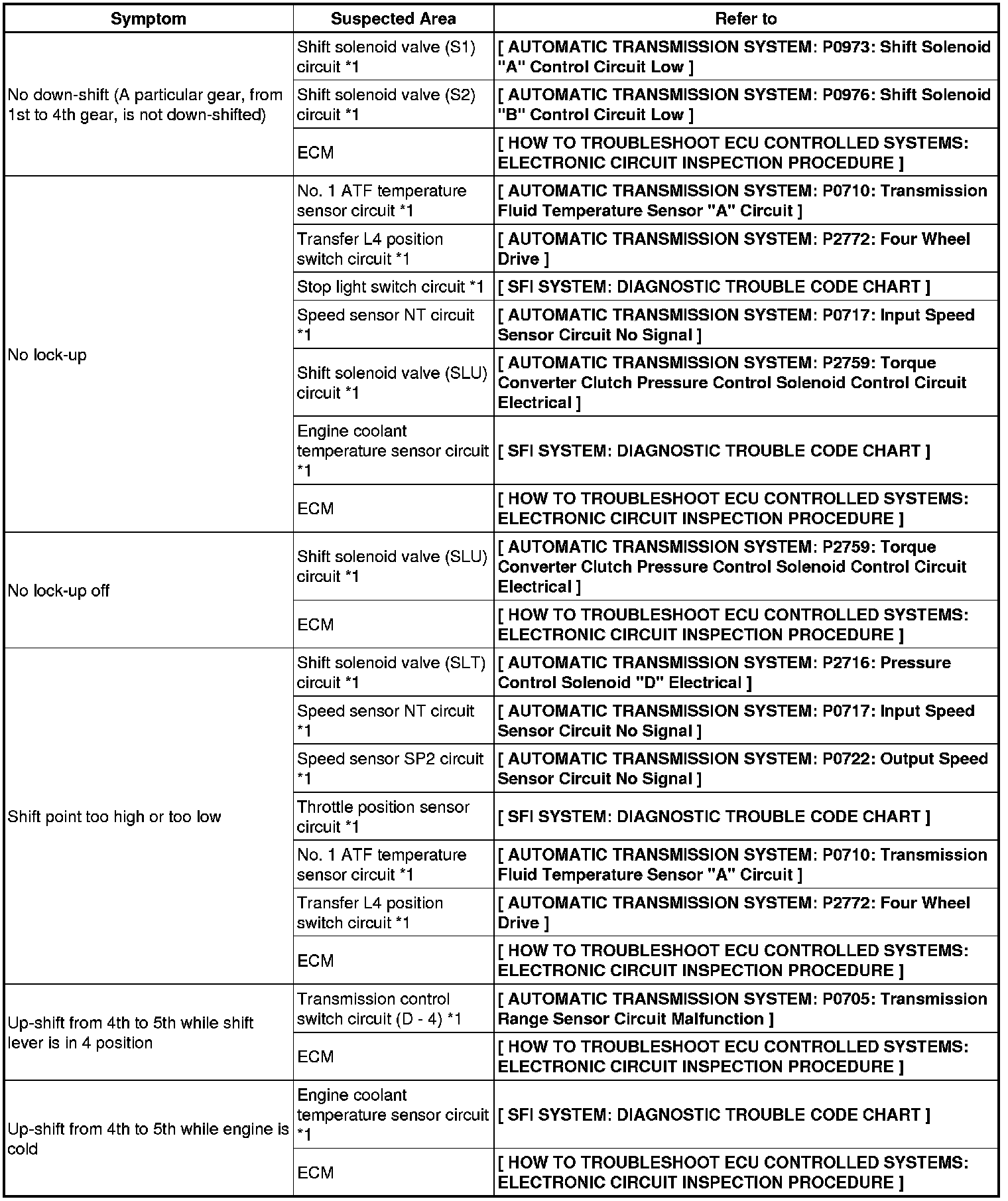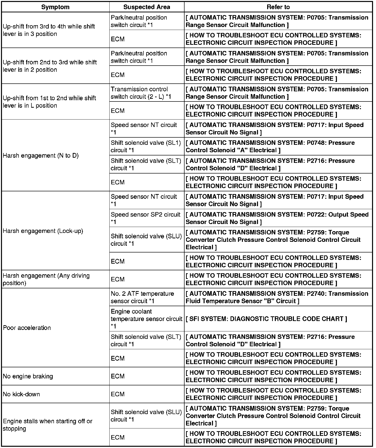 PROBLEM SYMPTOMS TABLE
