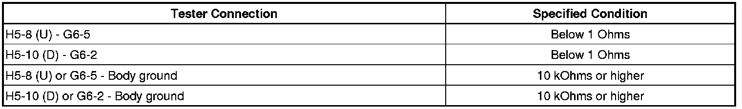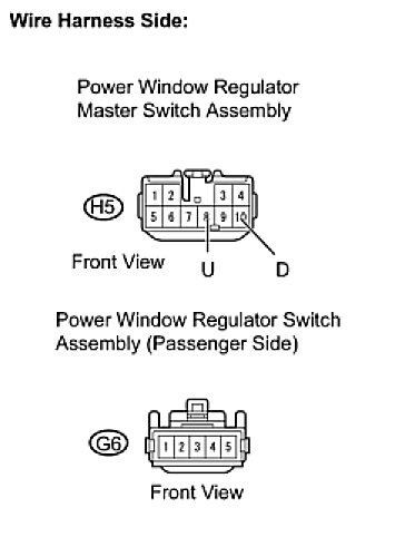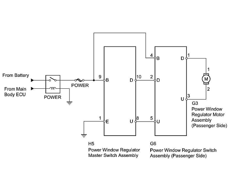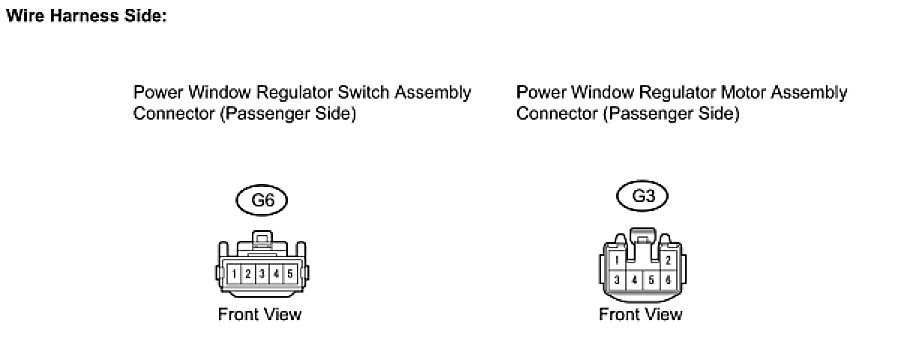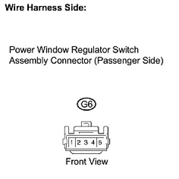 If the passenger side manual UP / DOWN function does not operate, a malfunction may be present in the power window regulator motor, power window regulator switch, power window regulator master switch or wire harness.