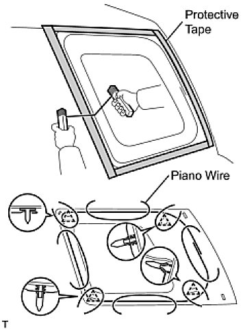 (b) From the interior, insert piano wires between the vehicle body and quarter window, as shown in the illustration.