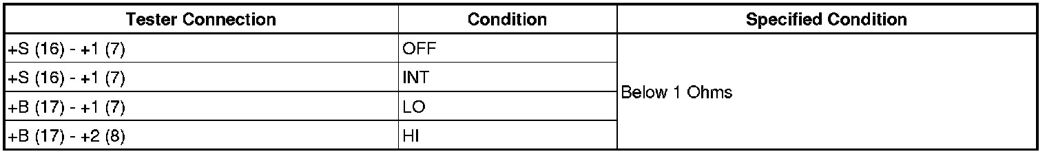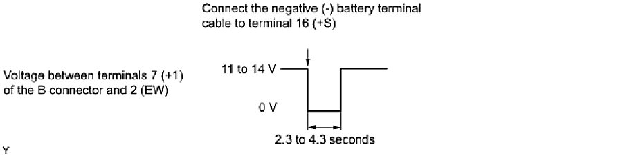 (5) Connect the negative (-) battery lead to terminal 16 (+S). Operate the intermittent wiper relay and check the voltage between terminals 7 (+1) and 2 (EW).